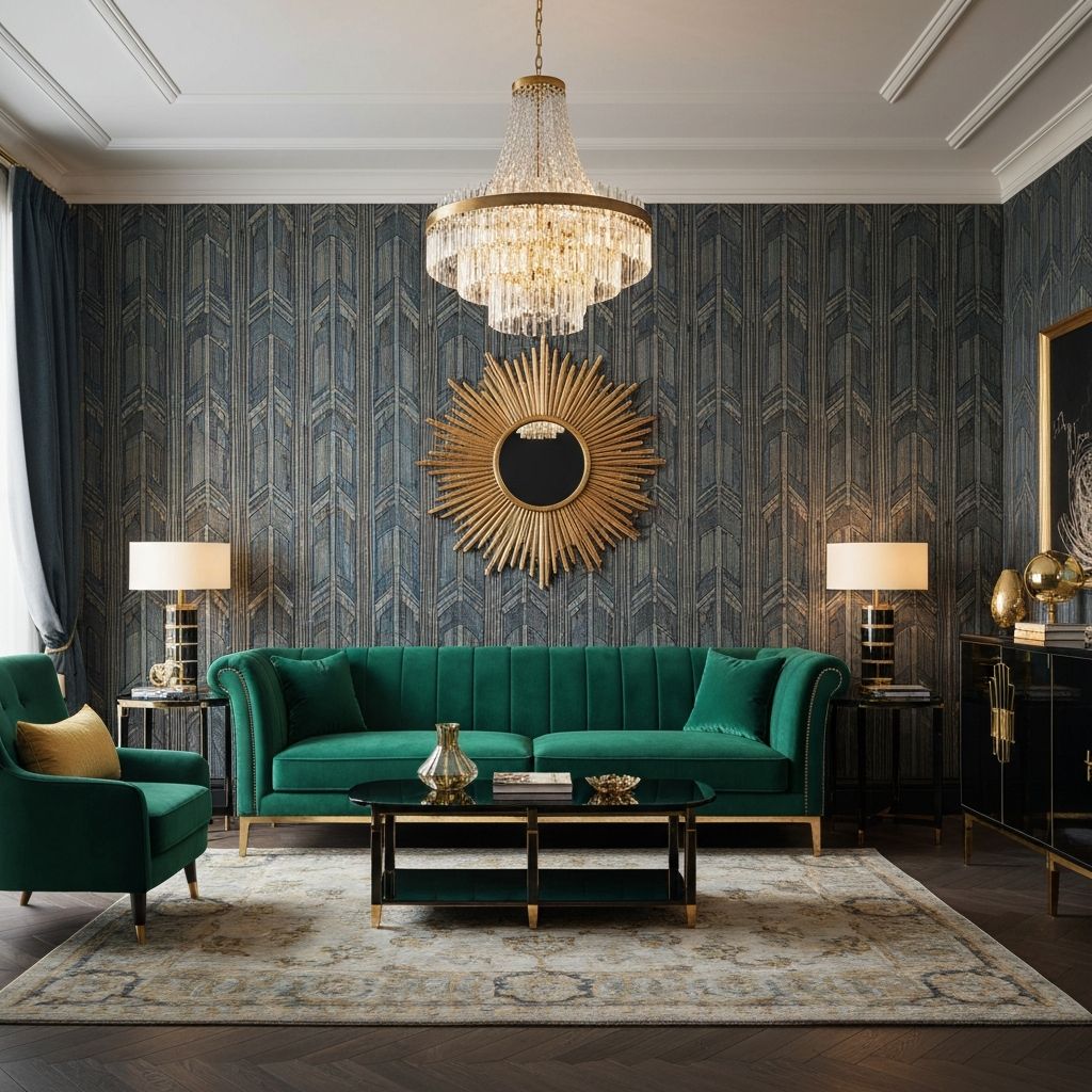 Glamorous, luxurious style featuring bold geometric patterns, rich colors, and lavish ornamentation. Celebrates opulence and craftsmanship.